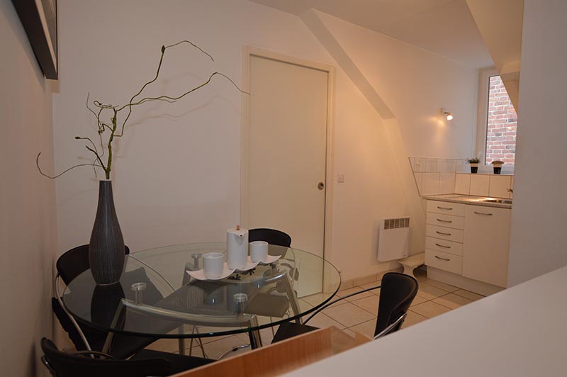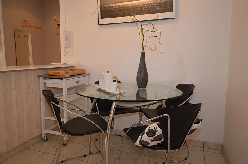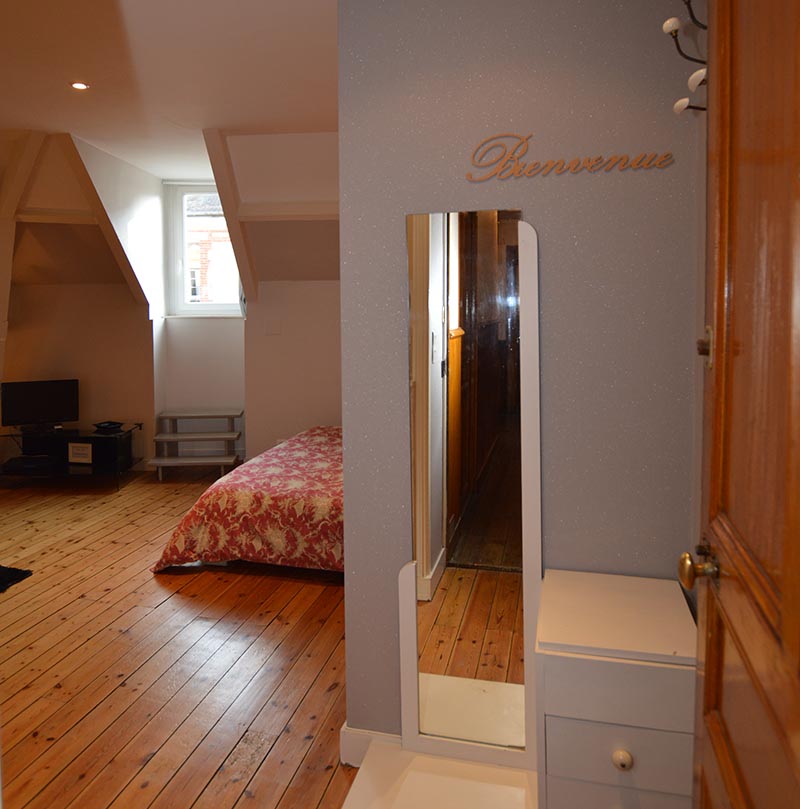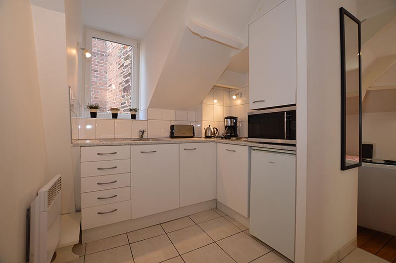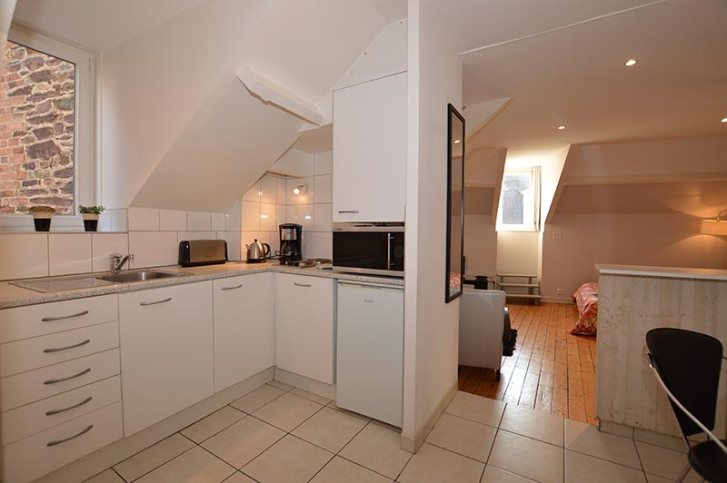 A votre arrivée vous découvrez l’appartement : entrée, coin salon avec deux fauteuils et télévision, coin couchage avec lit 160×200 fait à votre arrivée, cuisine équipée pour 4 personnes (four micro-ondes, cafetière, bouilloire…), salle d’eau avec wc. Internet en wifi dans tout l’appartement (fibre optique). Draps, linge de toilette et chauffage compris.
